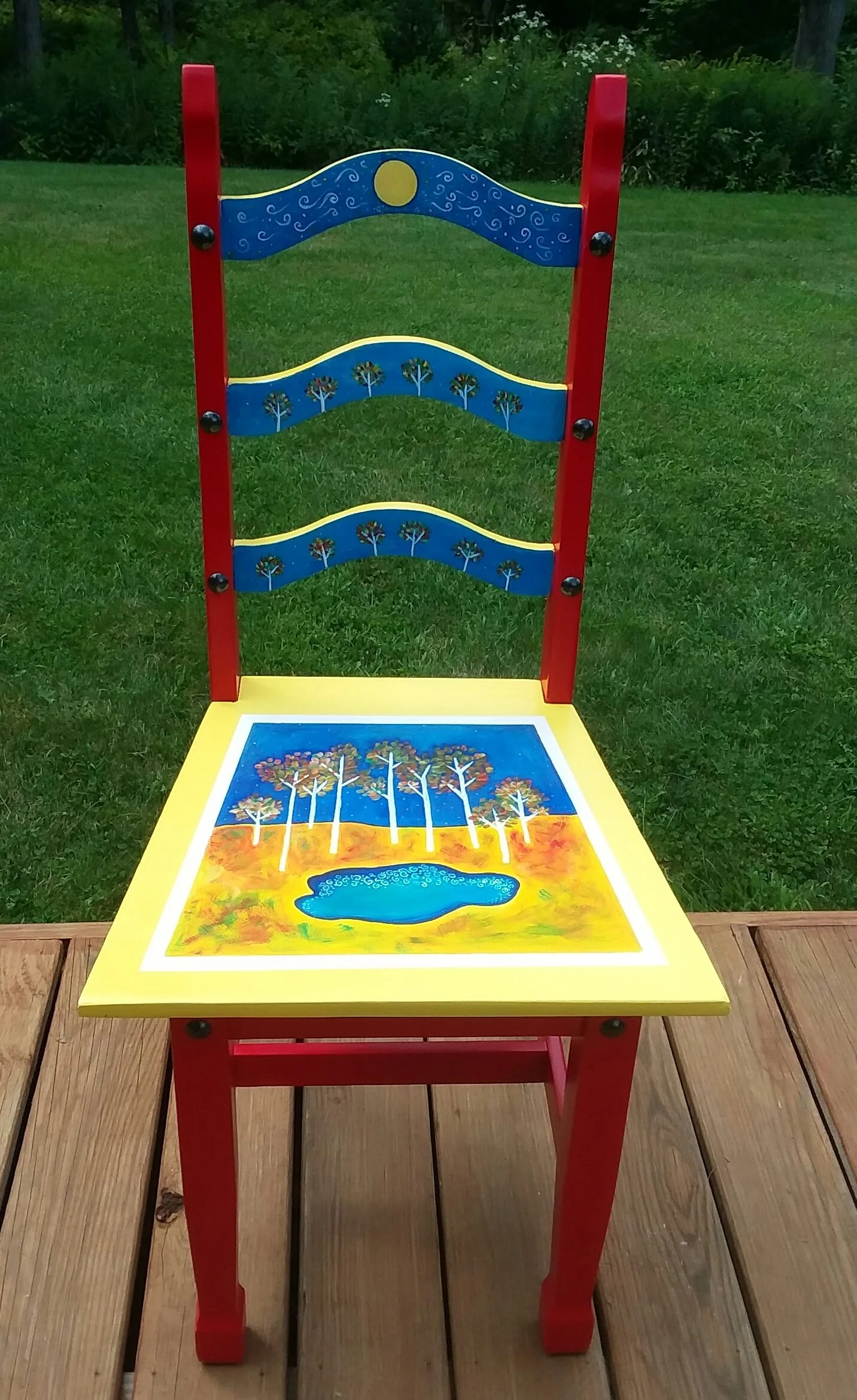 A chair that I painted for a charity auction that had many bids. The painting was inspired by my painting and card “By The Lily Pond “.