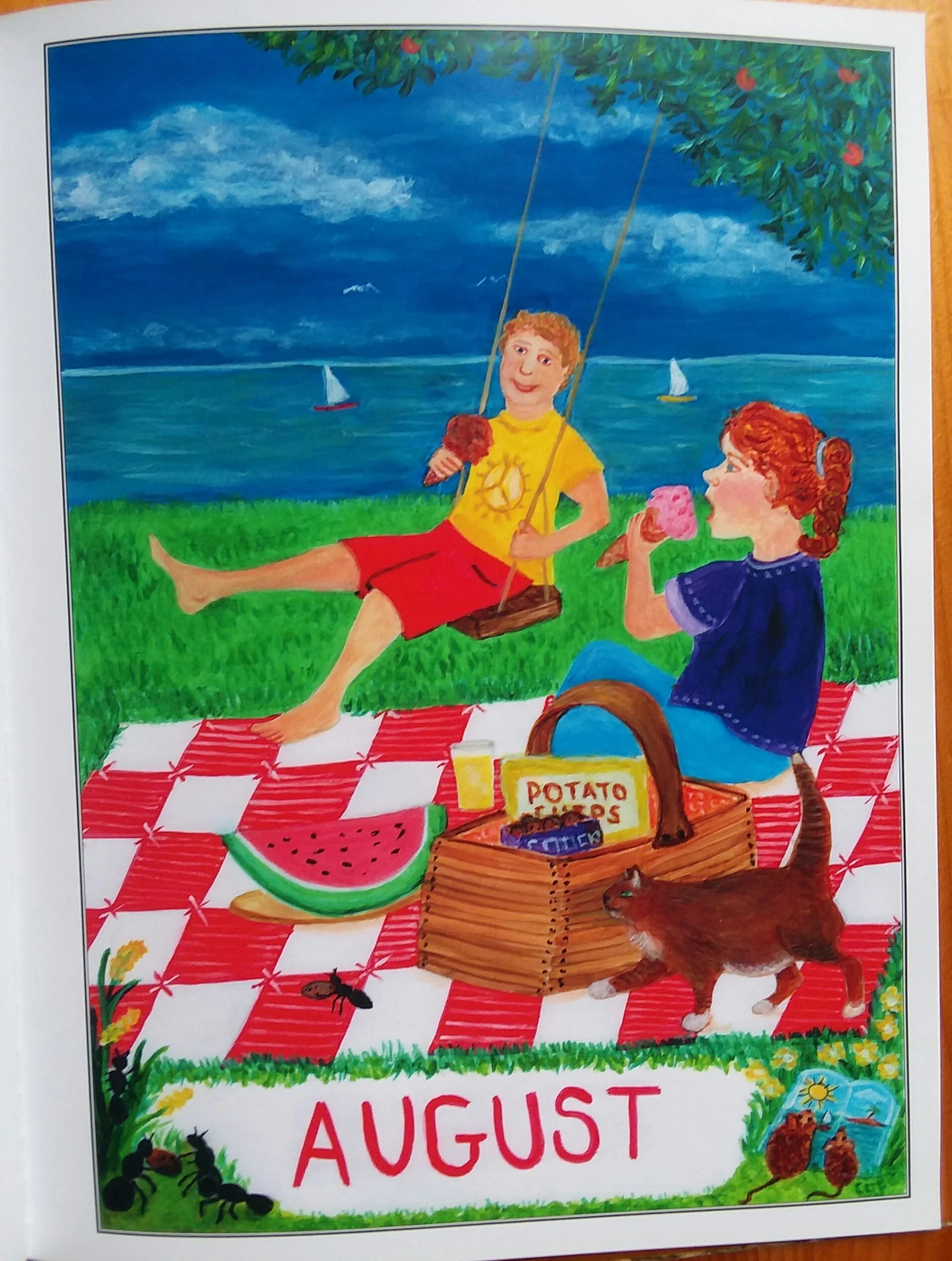 August is hazy and lazy a lot as the weather tends to be more humid and stormy. It is a good time for picnics with watermelon, chips, cookies, lemonade and of course, ants. How wonderful to sit on a swing under a favorite tree and watch the clouds roll by or gaze at the boats with their sails catching the breeze. The buzzing of cicadas and the chirping of crickets fills the air-natures musicians.